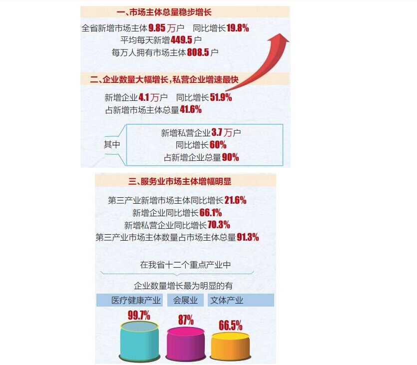 海南省主體總量穩(wěn)步增長,海南全省新增市場體9.85萬戶,同比增長百分之19.8平均每天新增449.5戶,每萬人擁有市場主體808.5戶。